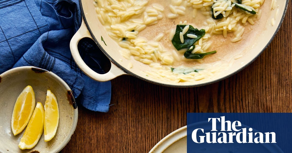 Tip the orzo into the garlic butter pan, stir in the remaining parmesan, then add the spinach, pour in 200ml of the reserved pasta water, and shuffle and fold the spinach into the orzo as it wilts. This should flow like a loose risotto, so add more pasta water as the orzo swells and stiffens.
