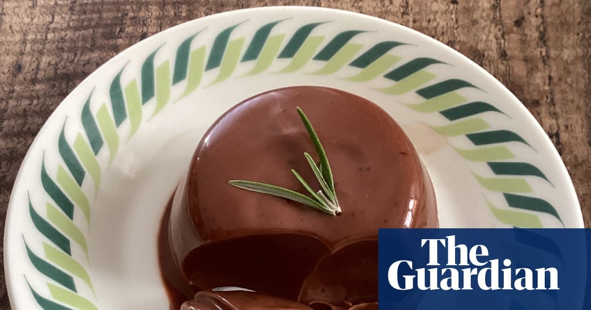 An intense and balanced mix of pine, eucalyptus and camphor, rosemary is a strong-minded and complementary match for the dark roasted, fruity, malty, almost sweaty flavour of dark chocolate; two such strong elements, both of which are rounded by the cream. Another benefit of adding dark chocolate to panna cotta is that it negates a common and annoying problem: that the final set is rubbery rather than tender and wobbly. This is because the chocolate, diluted in a large amount of cream and dominating the gelatine, takes control of the panna cotta, setting into a thick, smooth, almost velvet texture. In order to infuse the cream with the rosemary, though, it is essential to warm it gently and slowly, so sit the pan on a low heat and watch it carefully – it should almost (but not quite) come to a boil.
